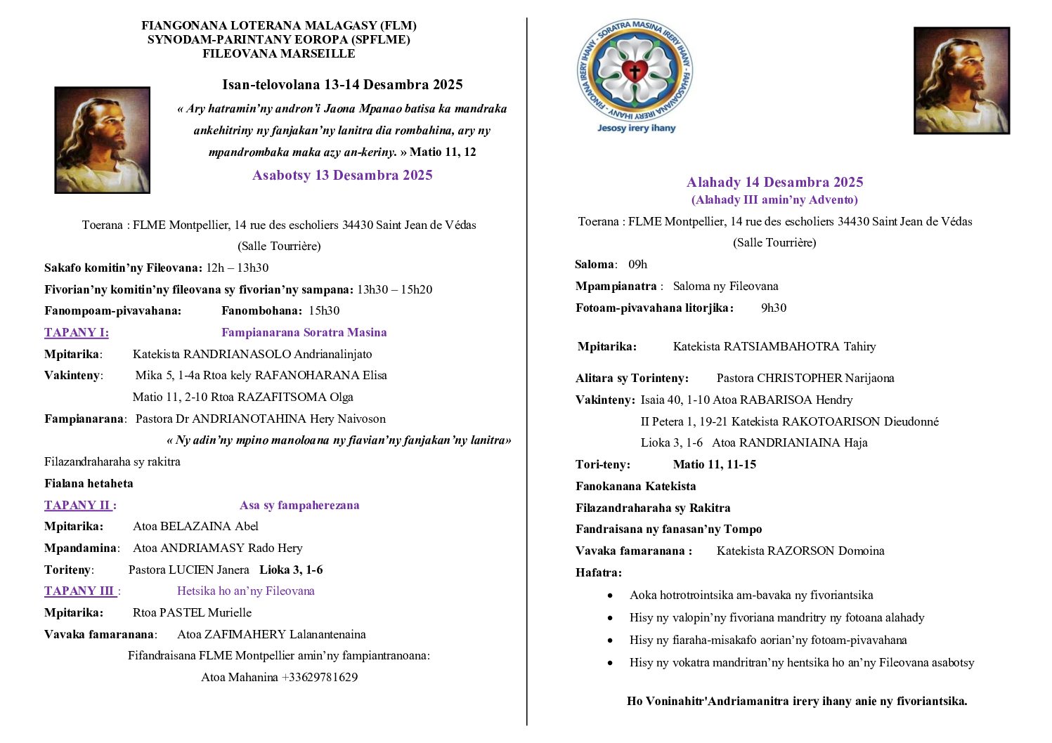 2 – Asabotsy 13 sy alahady 14 desambra 2025 : Isan-3volana Fileovana Marseille