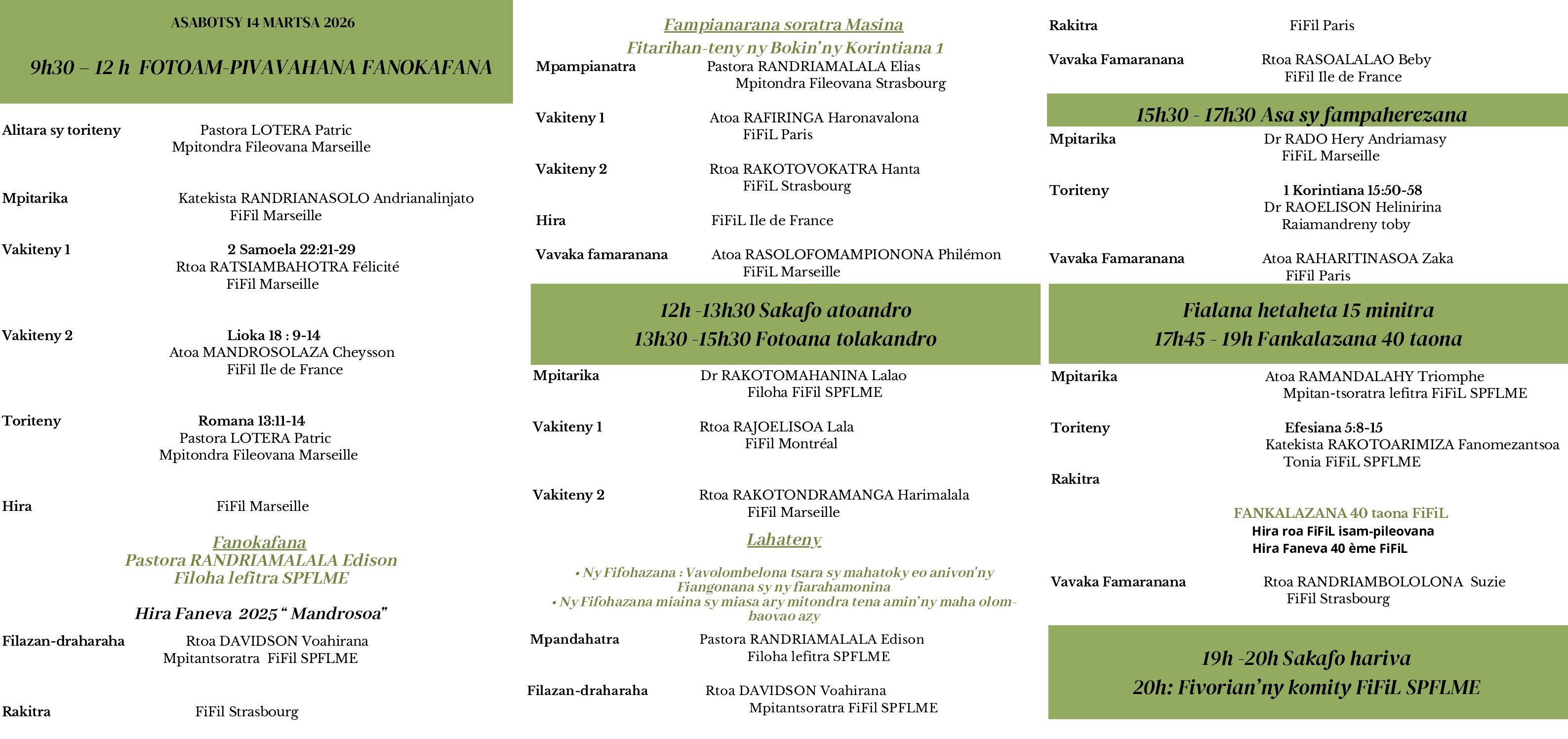 3 – Asabotsy 11 sy Alahady 12 Aprily 2026 – 10h30 : Isan-droavolana Fitandremana Marseille atao any amin’ny FLM Genève